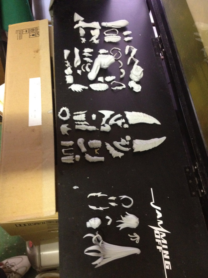 キャストで抜き終えたばらばらで白一色のフィギュアをわきメカに渡して