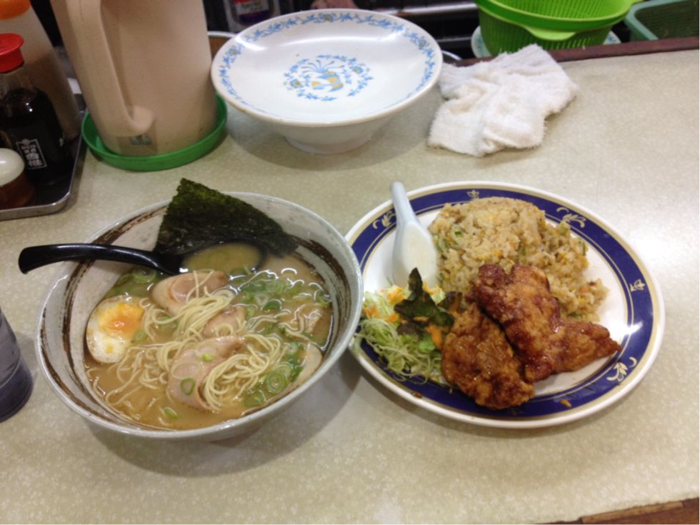 食べたいのが甘酢がかかった唐揚げ。でチャーハンとラーメンの定食。